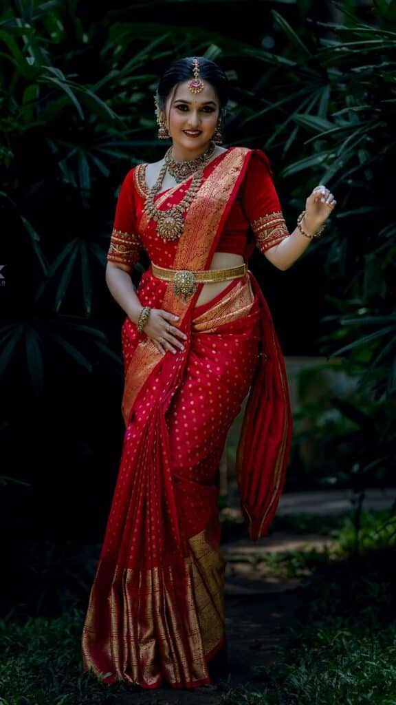 Unlike the conventional six-yard saree, the Madisar requires precise wrapping and experienced draping skills. The silk saree, often in muted gold, maroon, or traditional red, is styled to reflect modesty and Vedic purity.