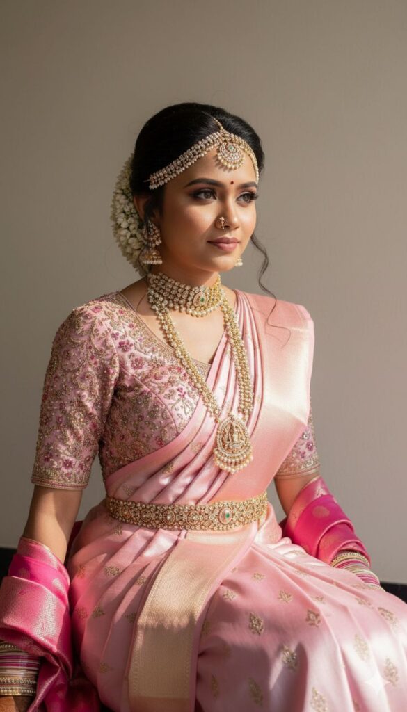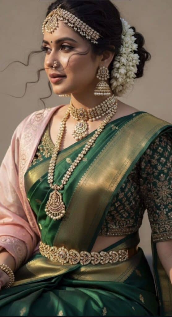 Soft blush pink, mint green, ivory, powder blue, and lilac silk sarees introduce elegance without overpowering tradition. Jewellery shifts towards diamonds, uncut stones, or lighter gold sets. Hair styling becomes softer—loose waves, half-braids, or minimal floral accents.