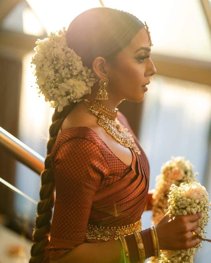 For intimate temple ceremonies, many brides opt for simplicity. A lightweight silk saree, minimal jewellery layering, fresh jasmine garlands, and natural makeup create a serene and sacred aesthetic.