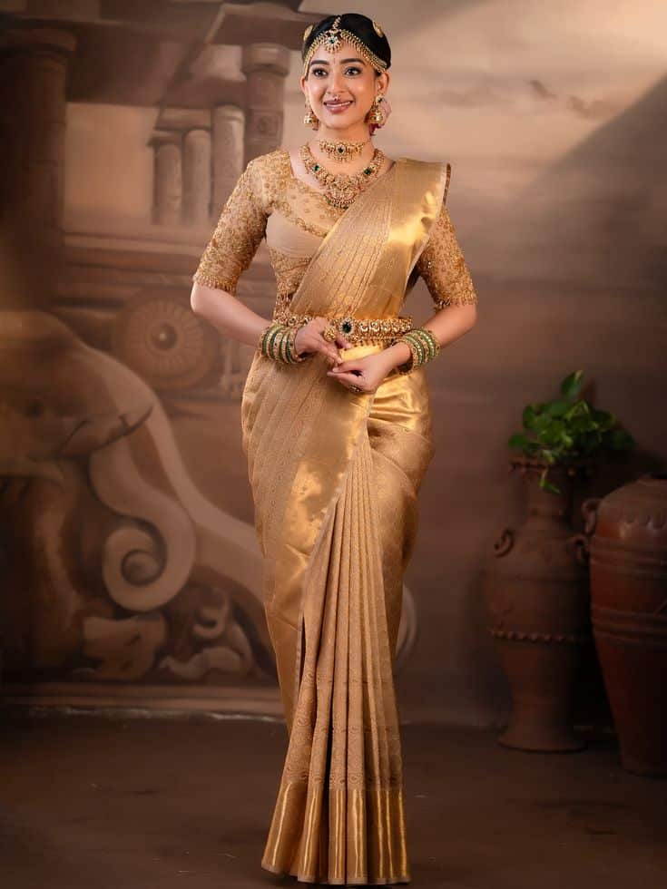 Motifs such as peacocks, mango patterns (manga malai inspiration), and temple borders elevate the grandeur of the saree.