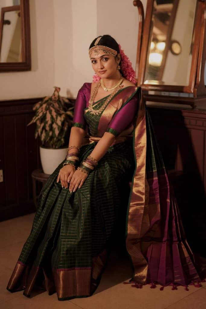 Contrast has always been central to Tamil bridal aesthetics. Maroon paired with emerald green or royal blue borders creates striking depth and richness.