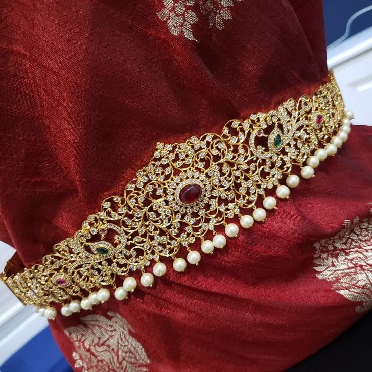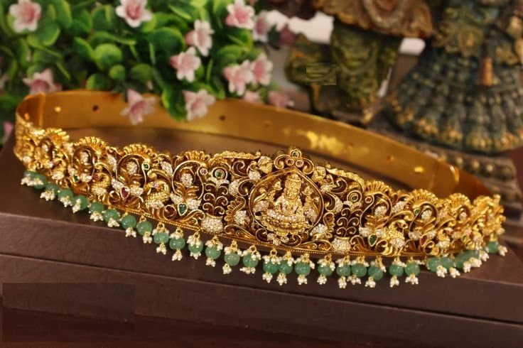 The oddiyanam or bridal waist belt is both stylish and functional — it helps hold the saree or lehenga in place while accentuating the waistline.