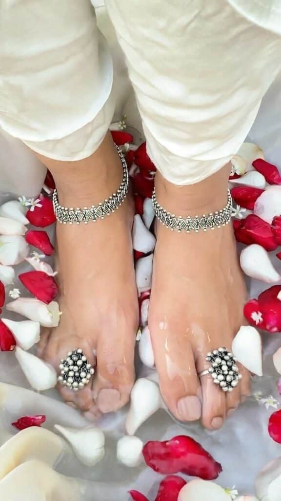 Once seen as an old-fashioned custom, anklets and toe rings are returning in modern weddings—with stylish upgrades. Delicate chain anklets, bell-lined silver sets, or even gold ones with tiny charms are adding magic to bridal looks.