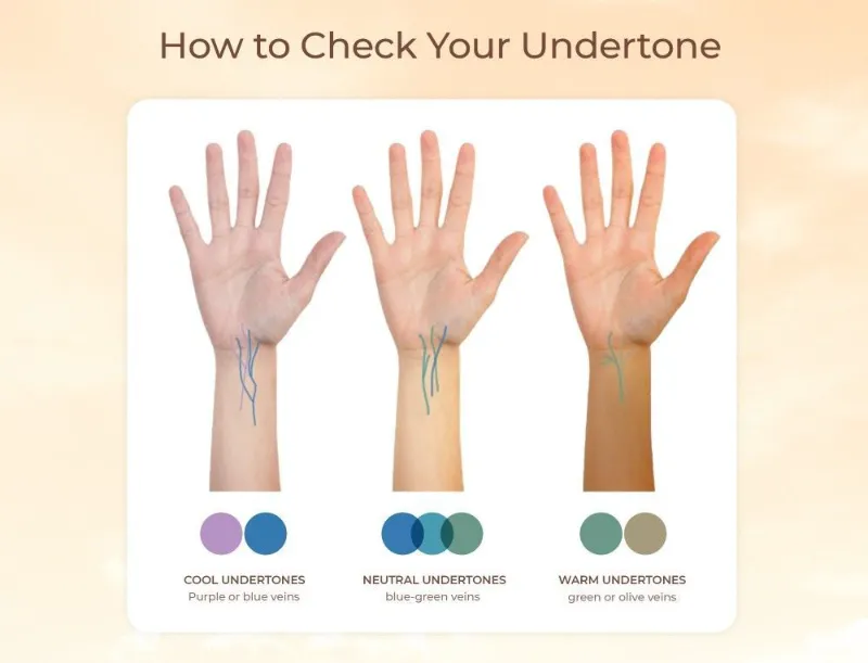 Check the veins on your wrist. If they appear blue or purple, you likely have cool undertones. If your veins look greenish, your undertone is warm. If you can’t clearly determine if your veins are blue or green, you may have neutral undertones.