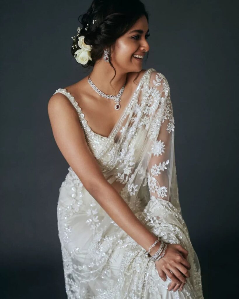 Beyond symbolism, sarees also allow for individuality. Fabric choices range from silk and handloom to richly embroidered modern designs. Colours are no longer restricted to white or off-white. Brides now choose champagne, ivory, blush, gold, pastel pinks, and even muted blues or greens, reflecting personal taste while respecting tradition.