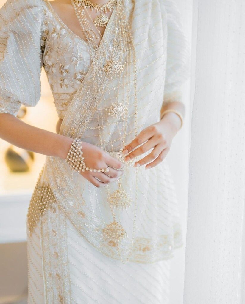 In Kandyan weddings especially, the saree represents ceremonial dignity. The draping style, jewellery, hair, and accessories together create a look that is instantly recognisable and deeply rooted in heritage. Wearing a saree can feel like honouring your lineage, acknowledging rituals, and stepping into a role that generations of women before you have embraced.
