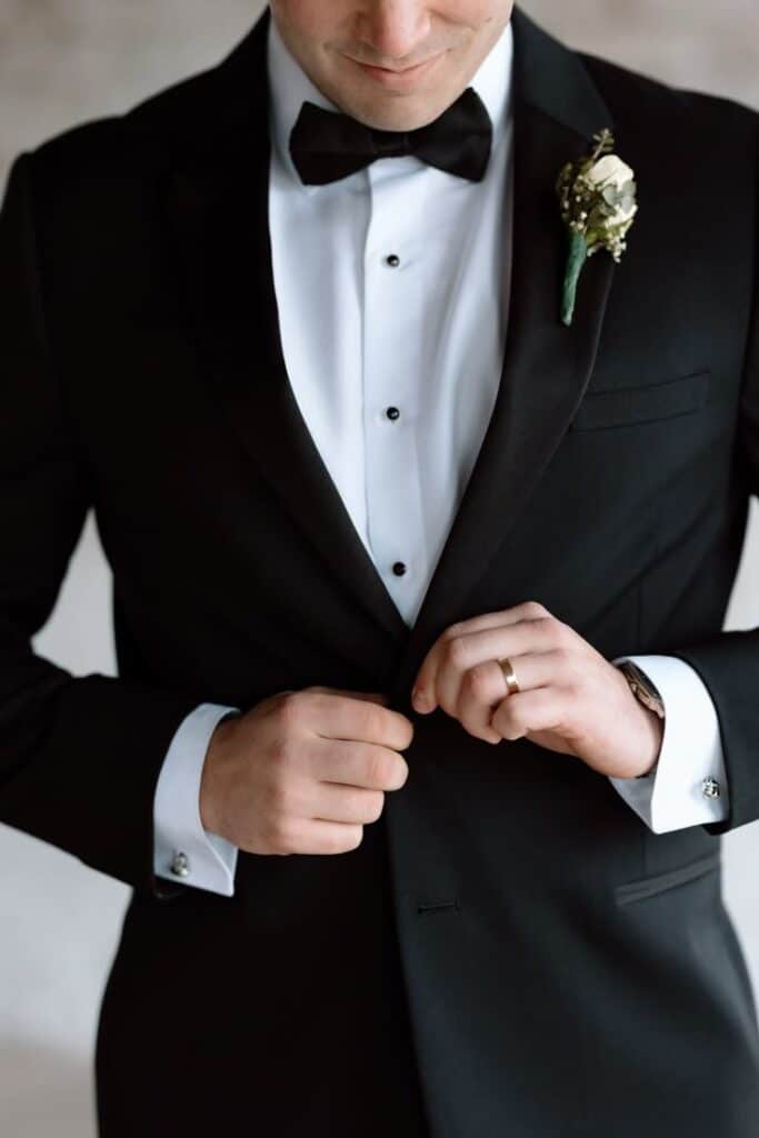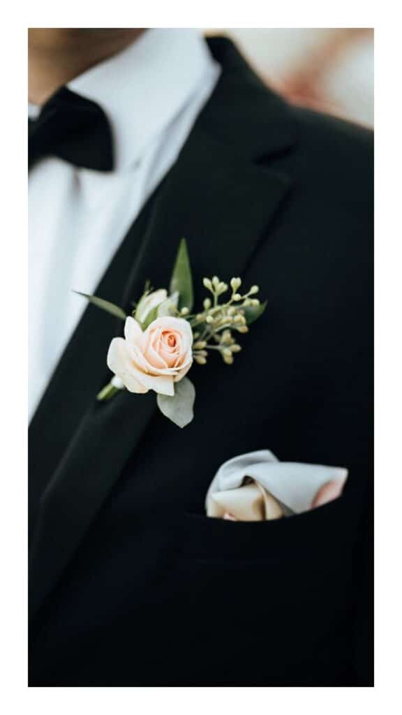 A boutonniere may be small, but it carries powerful symbolism. Traditionally worn on the left lapel, it often mirrors the bridal bouquet. A single rose, a sprig of baby’s breath, or even a unique floral design can make the groom’s outfit stand out. Modern groom style experiments with non-traditional options too—like feathers, herbs, or metallic pins for minimalist sophistication. Regardless of the design, the boutonniere adds a fresh and romantic touch, reminding everyone of the occasion’s sentiment.