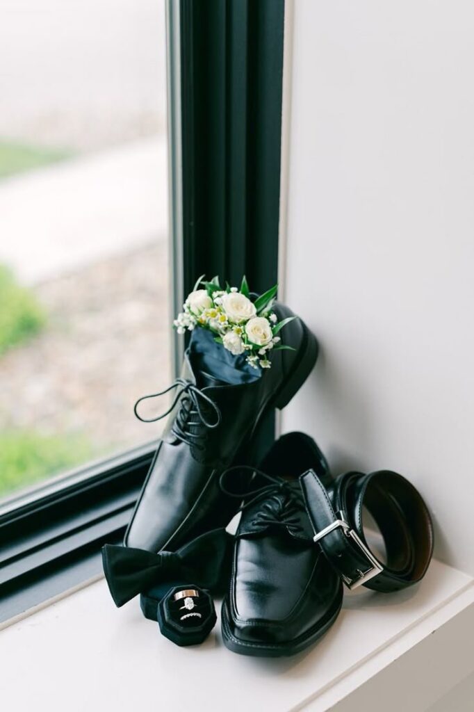 Shoes are the cornerstone of a groom’s outfit. Classic black leather oxfords remain the most timeless choice, especially for traditional tuxedos and formal ceremonies. For grooms opting for navy, charcoal, or grey suits, polished brown brogues or loafers offer a stylish alternative. Beyond color, comfort matters—since the groom will spend hours standing, walking, and dancing. Investing in high-quality leather ensures both lasting comfort and a polished finish, making shoes one of the most vital elements of groom style.