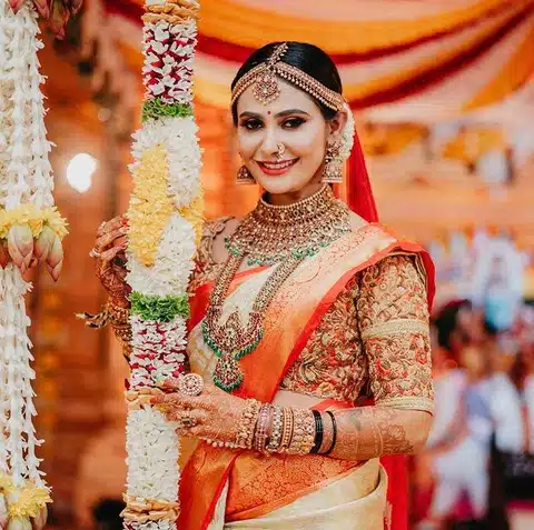 - Brides wearing silk sarees or lehengas