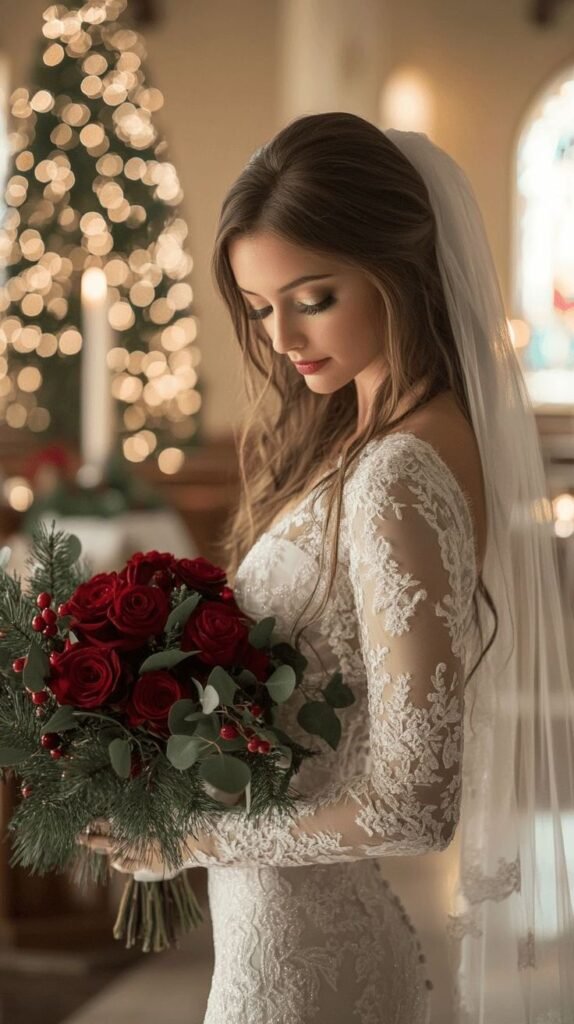 Velvet, silk, and richly embroidered fabrics suit Christmas weddings beautifully.