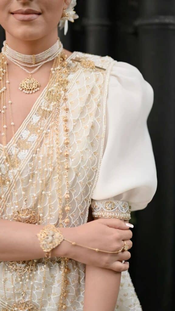 In traditional Sri Lankan, South Asian, or Tamil bridal settings, jewelry plays a larger symbolic role. However, even in culturally rich ensembles, refinement still applies.