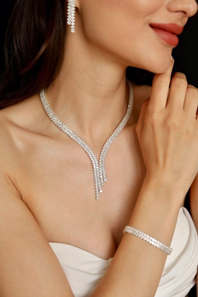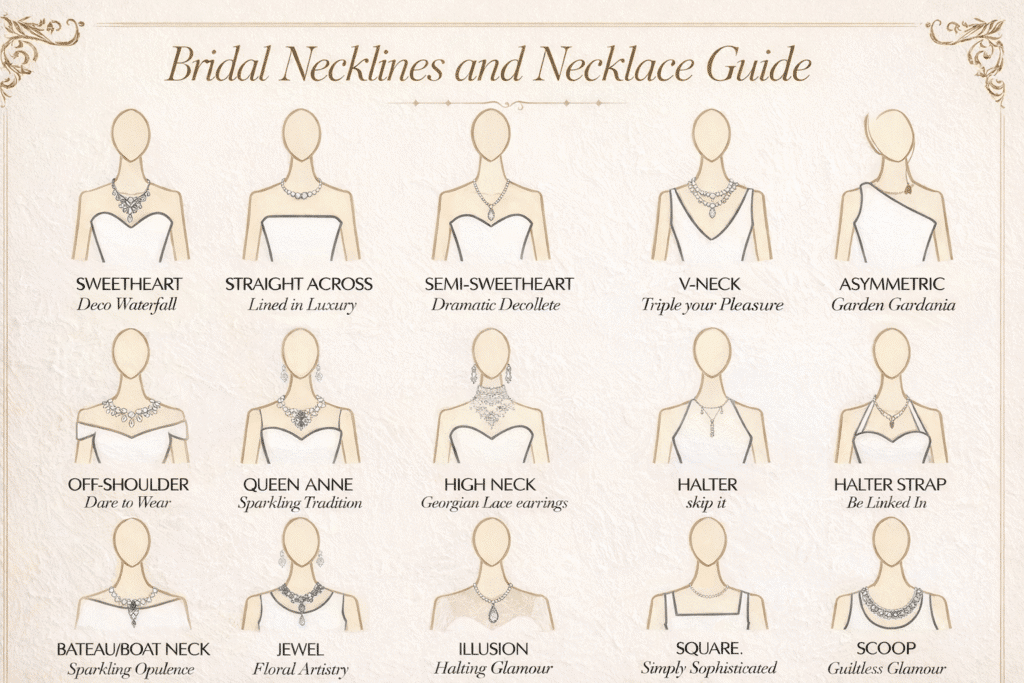 These styles allow flexibility. A delicate pendant, a fine diamond collar, or even a subtle choker can work beautifully. However, if your gown has detailed embroidery near the bust, consider skipping the necklace entirely and focusing on earrings.