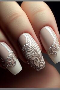 For brides who love a bold look, 3D embellishments like tiny pearls, crystals, or lace overlays add depth and drama to your nails.