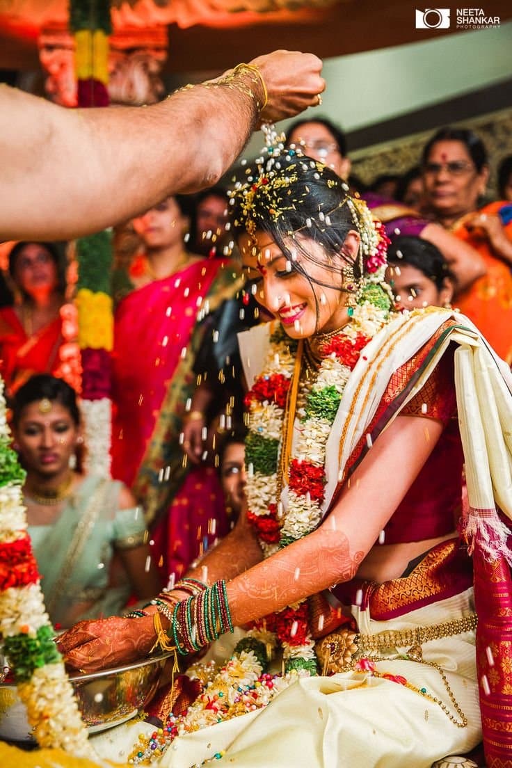 The Exchange of Garlands: A Symbol of Acceptance In a joyful display of mutual acceptance, the bride and groom exchange floral garlands. This tradition, known as ‘Maalai Maatral’, is often accompanied by playful teasing from the relatives, adding a touch of light-heartedness to the solemnity of the ceremony.