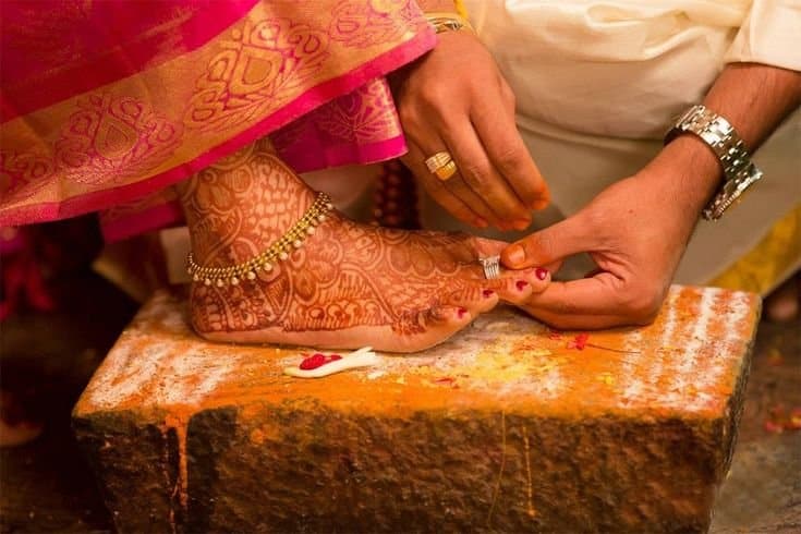 Saptapadi: Seven Steps Together Following the Thali tying, the couple takes seven steps together, known as ‘Saptapadi’ or ‘Seven Vows’. Each step represents a promise made to each other, encompassing aspects like respect, love, fidelity, and prosperity. With each step, they affirm their commitment to walk through life as partners.