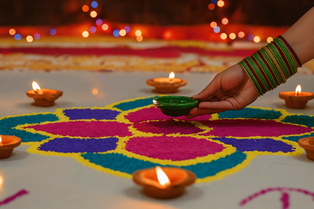 Kolams—intricate designs drawn with rice flour—decorate the wedding entrance. They are more than aesthetics; they invite abundance and ward off negative energy.