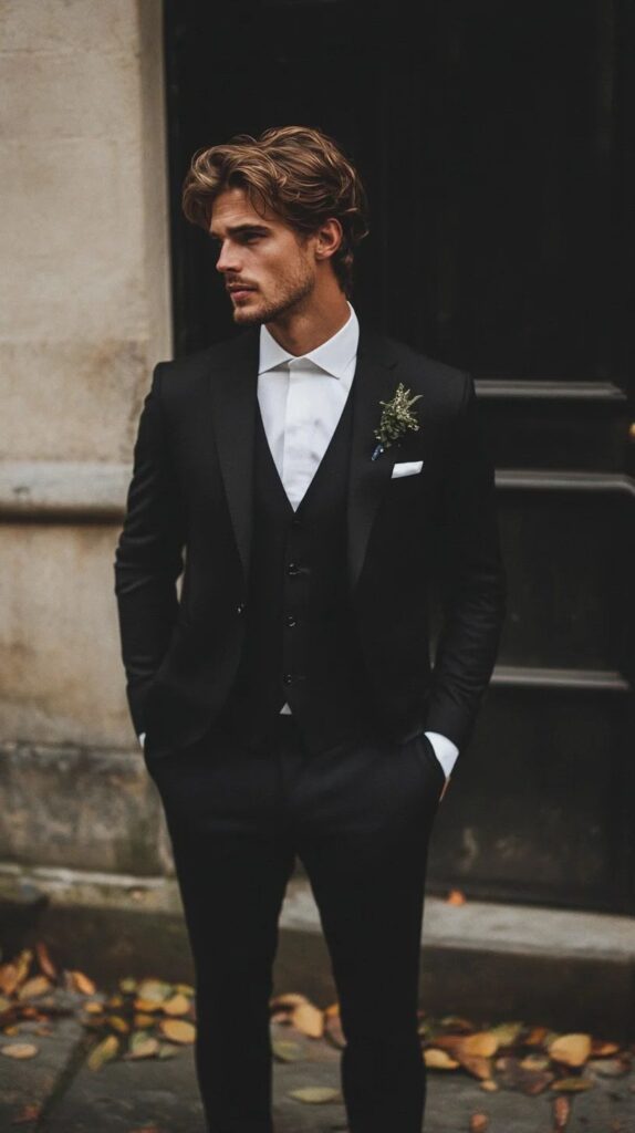 A waistcoat suit—commonly called a three-piece suit—includes a jacket, trousers, and a matching vest. It is versatile, adaptable, and less rigidly formal than a tuxedo.