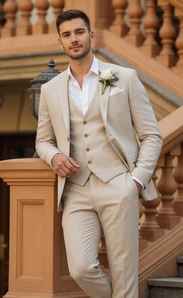 For outdoor ceremonies or warmer seasons, fabric selection becomes strategic. Lightweight wool blends, linen blends, or tropical suiting materials perform significantly better in humid conditions.