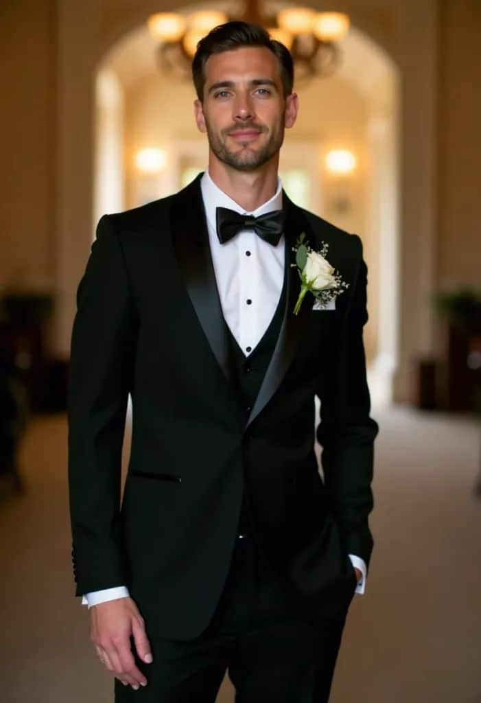 If the wedding design is dramatic, structured, and high-luxury, the tuxedo reinforces that identity. If the wedding is romantic, airy, or modern-minimalist, a waistcoat suit often integrates more fluidly.